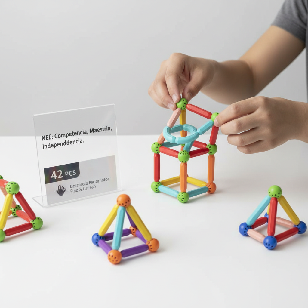 El Juego de Bloques de Construcción Magnética de 42 piezas es una herramienta estratégica esencial, meticulosamente diseñada para el desarrollo de habilidades críticas en niños con Necesidades Educativas Especiales (NEE). Va más allá del juego recreativo, enfocándose en la construcción de competencia tangible, maestría progresiva e independencia operativa a través de la interacción práctica.