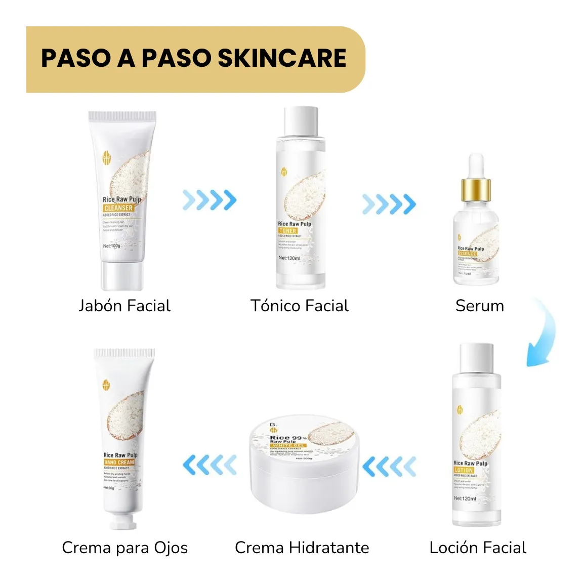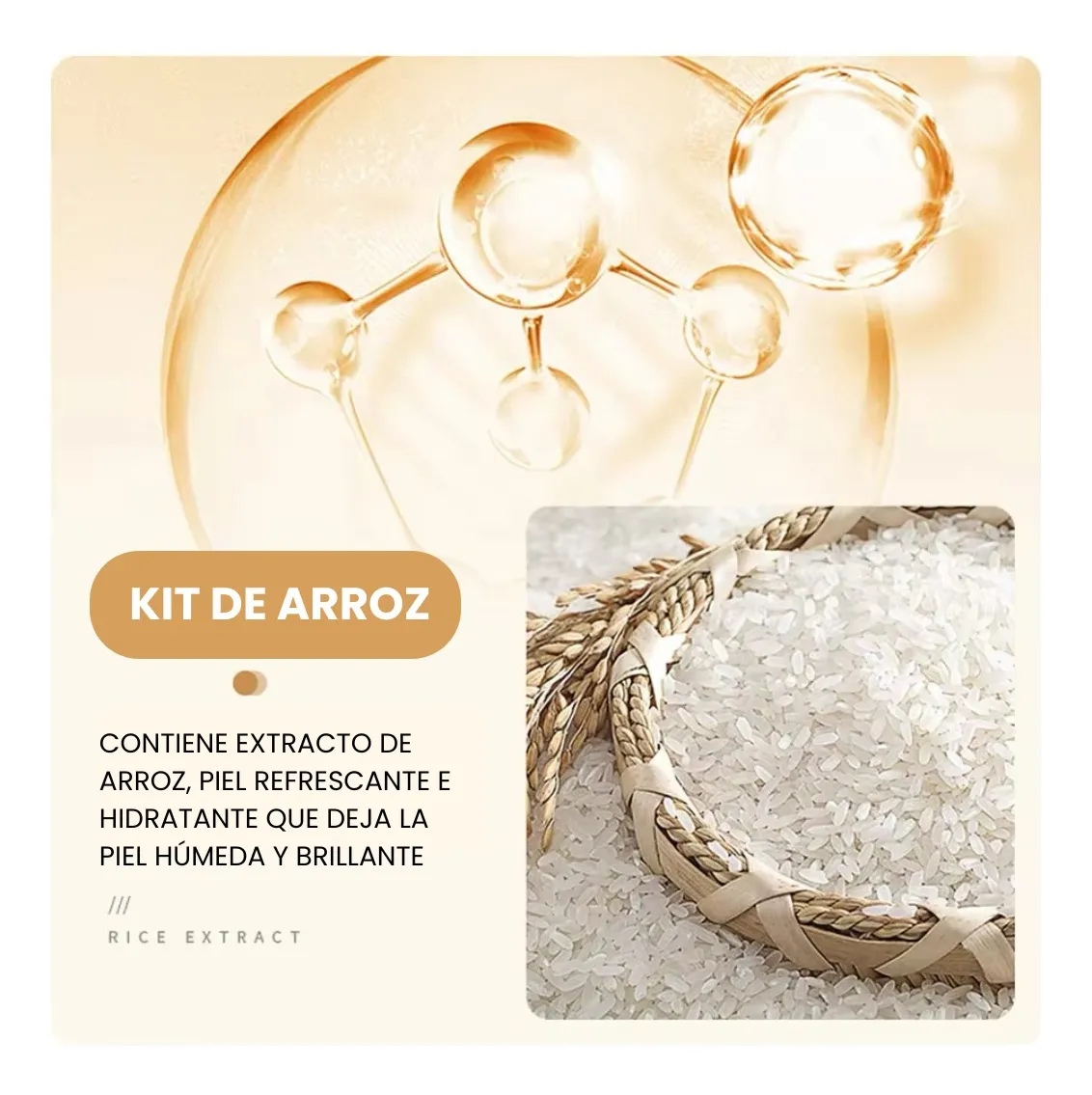 Este exclusivo kit combina los beneficios milenarios del arroz con la ciencia cosmética moderna. Con nuestra fórmula enriquecida con extracto de arroz premium rico en antioxidantes, aminoácidos y vitaminas B, lograrás una piel visiblemente más clara, uniforme y sin manchas en solo 4 semanas.
