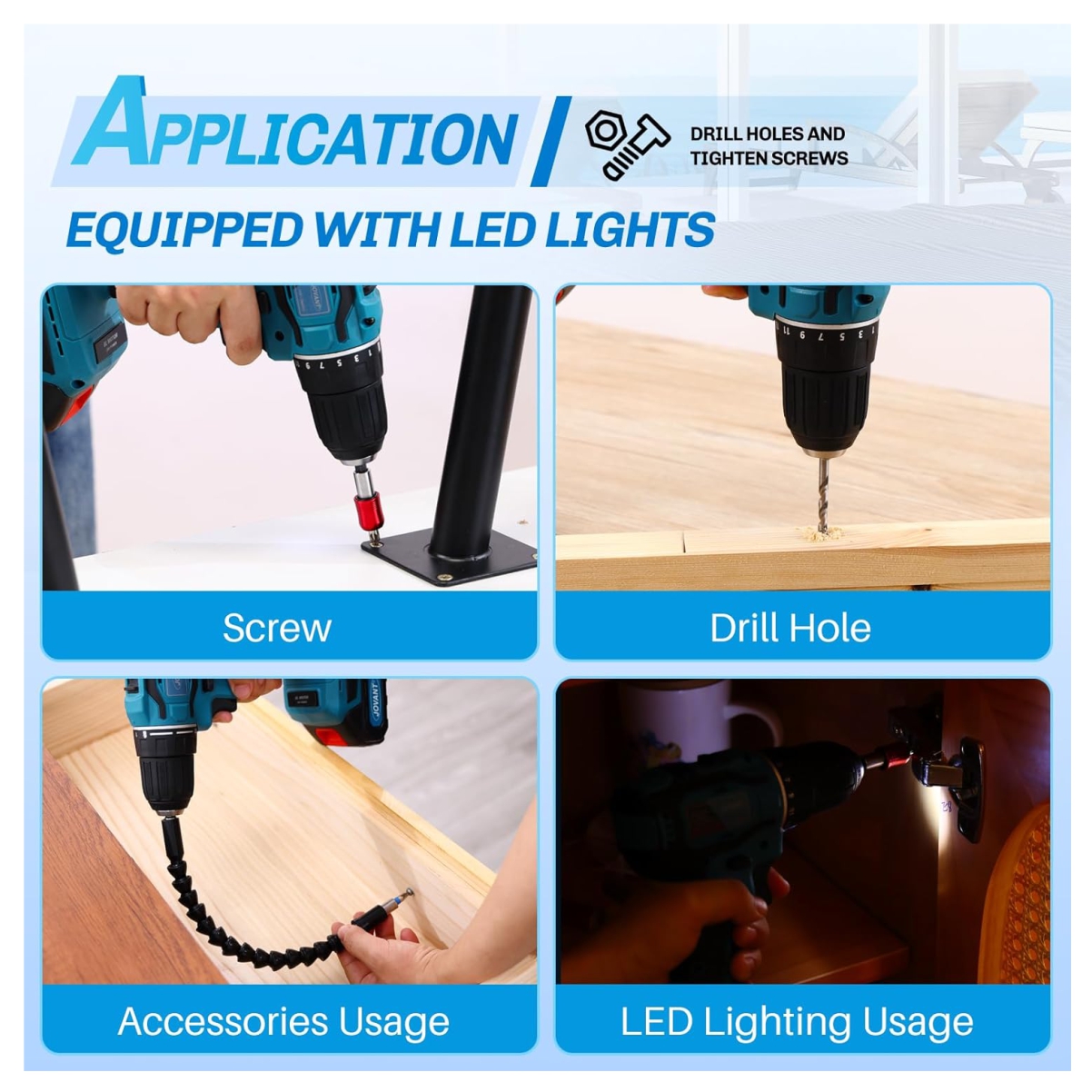 el taladro inalámbrico cuenta con luces LED integradas para mejorar la visibilidad, lo que le permite trabajar en cualquier lugar, en cualquier momento, incluso en esquinas oscuras y áreas con poca luz. Un botón de control de avance/retroceso determina la dirección de la herramienta y también sirve como un botón de bloqueo